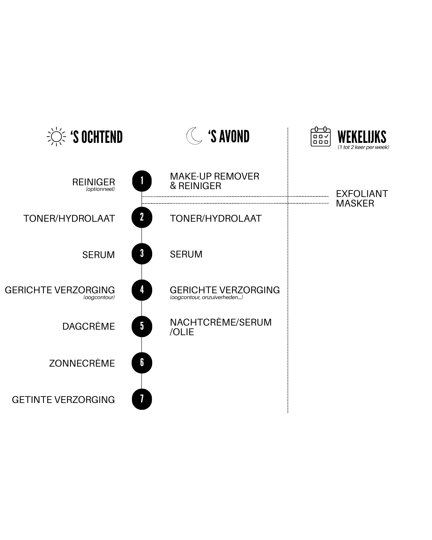 - Avond: kies voor herstellende of anti-aging actieve stoffen (zoals retinol, peptiden of hyaluronzuur) om de natuurlijke nachtelijke regeneratie te ondersteunen.