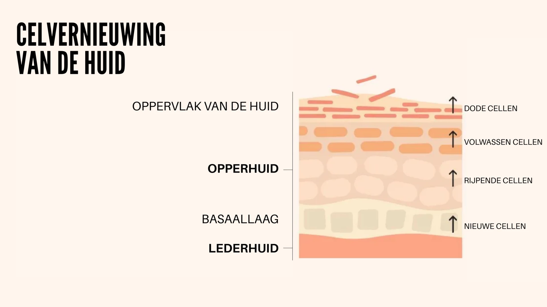 Gemiddeld duurt dit proces tussen de 28 en 40 dagen, afhankelijk van leeftijd en huidtype. Tijdens dit proces migreren de basale cellen van de opperhuid langzaam naar het oppervlak, waar ze de hoornlaag vormen en daarna vanzelf afschilferen. Daarom heeft elk product dat in de diepte werkt (zoals een hydraterende, anti-age, anti-vlekken of anti-imperfection crème) minstens één volledige huidcyclus nodig om effect te tonen.